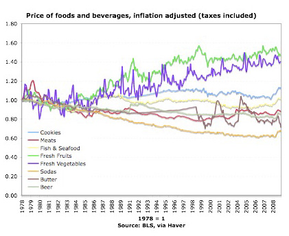 Scolds on both the right and left blame our lack of self-control and “personal responsibility” for obesity. Sure, that’s a factor, but it’s also a plain fact that many people couldn’t afford to eat healthily if they knew how and wanted to. The next chart shows the direct impact of government subsidies on food and beverage prices: