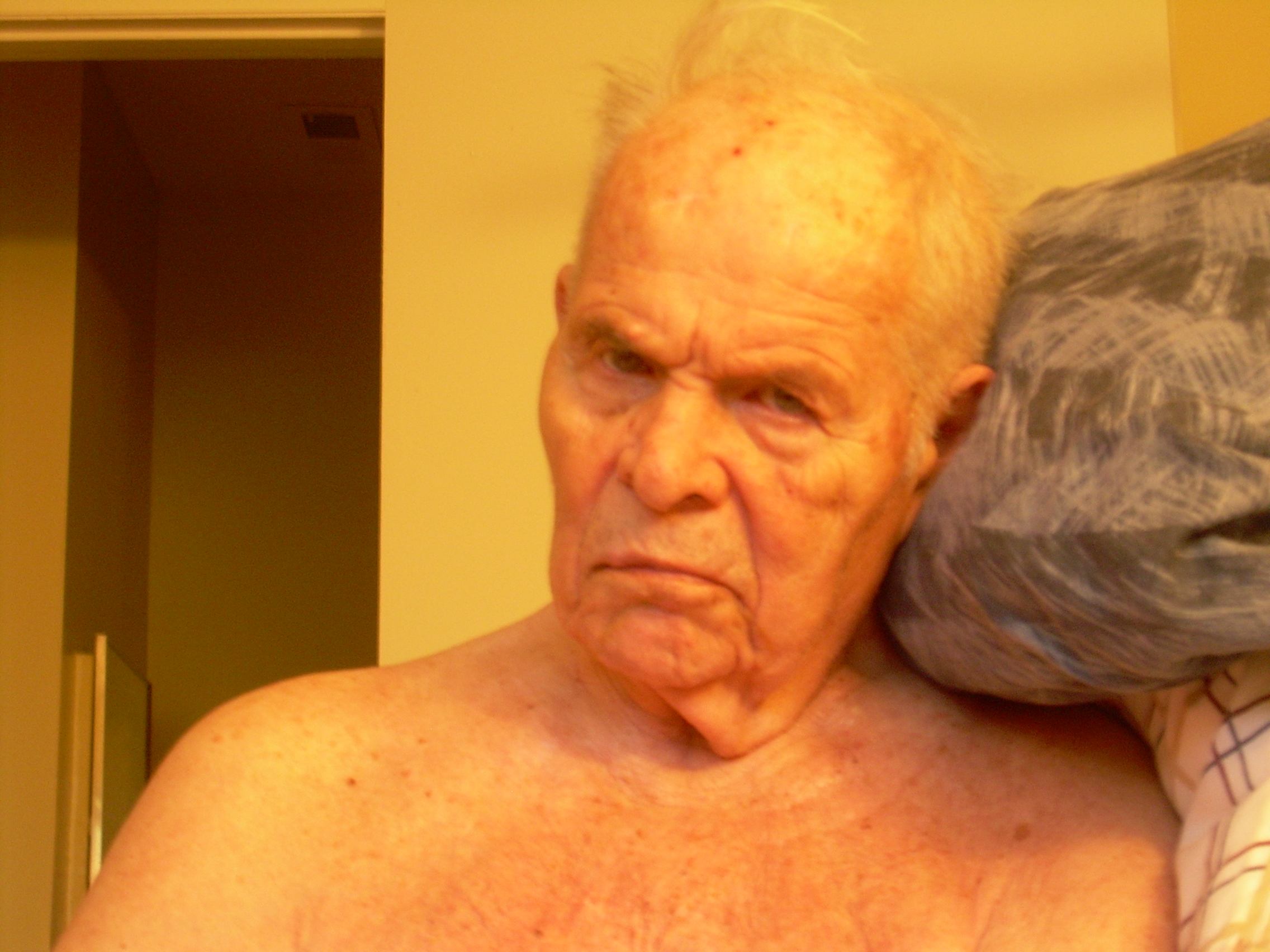Actually, he was scowling off to the right at the hospice chaplain, who had just offered to pray for him; but when I started to take his picture, he swiveled that gaze onto me.