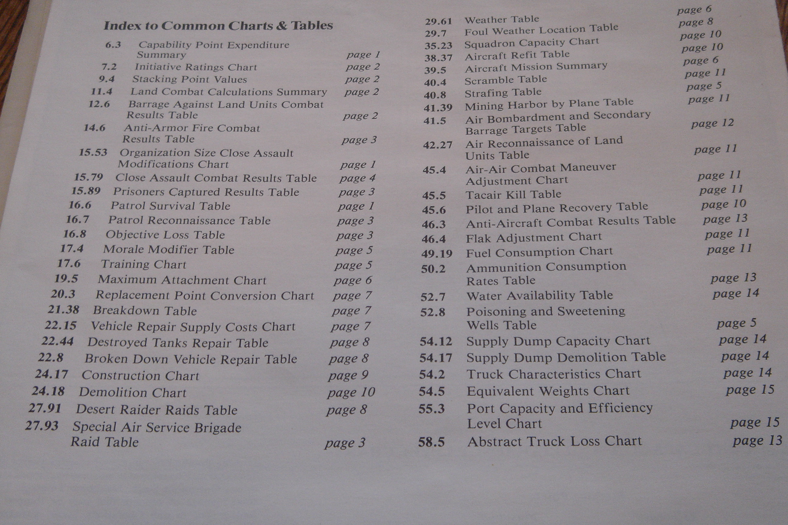 5 connected maps, each 2×3 feet….The rules are 48 pages long….for The Land Game. You add the Air and Logistics Rules and that’s another 44 pages. Each side has about 24 pages of charts just for them, not to mention the 16 pages of Common Charts & Tables. But, hey, let’s look at that one shall we? “41.39 Mining Harbor by Plane Table” “58.5 Abstract Truck Loss Chart” “52.8 Poisoning and Sweetening Wells Table” Eyeball it yourself!
