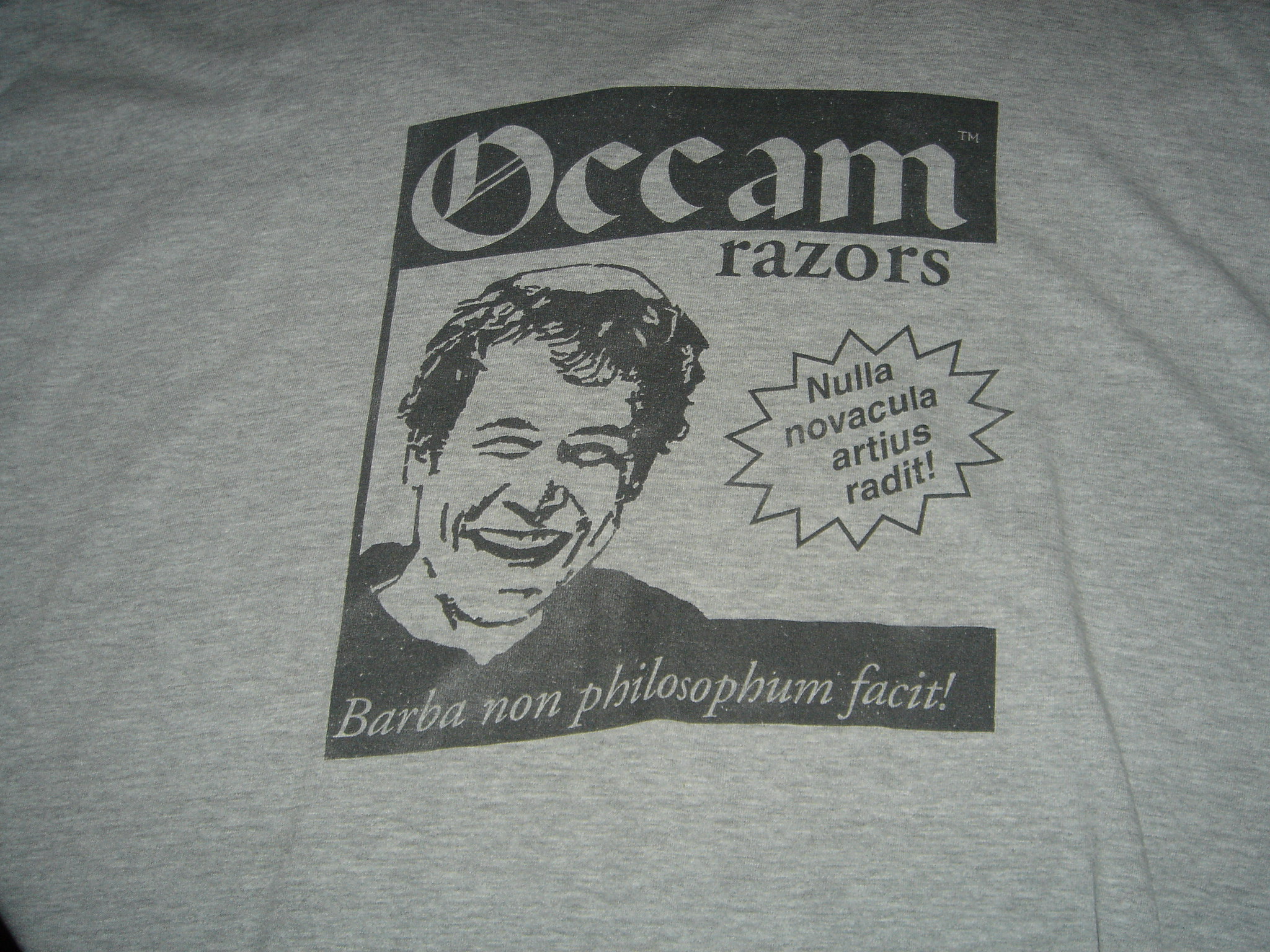 Cleaning up the old t-shirts, I forgot this one! The post title refers to the line on the bottom of the shirt. (Perhaps should be cross posted at Cloven, not Crested?) I think the other line means ‘No razor is sharper!’, but I could be wrong… The dude sort of looks like David Letterman!