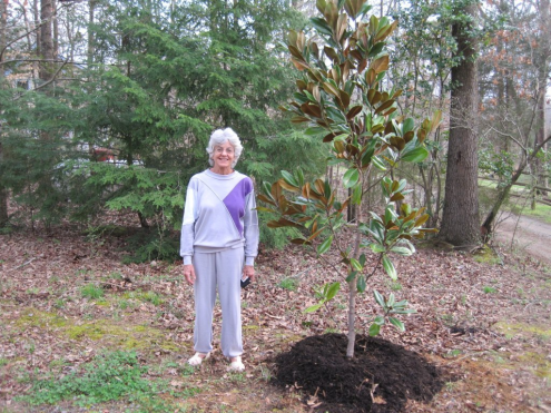 This young Magnolia grandiflora, planted today on my friend Chris’s land outside Chapel Hill, will incorporate some atoms of Jacques and will eventually grow to be 40 to 50 feet tall.